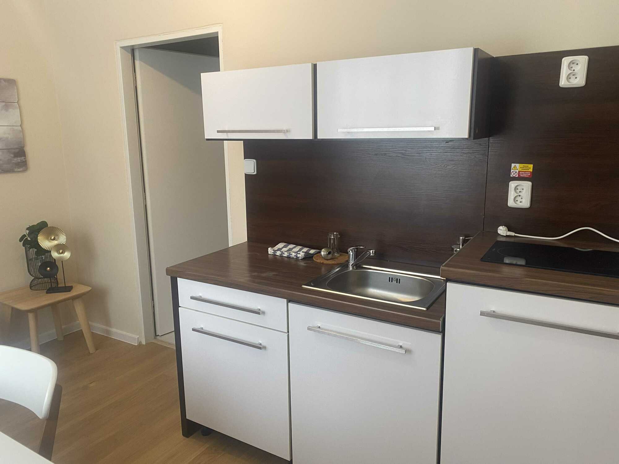 Útulný apartmán s vybaveným kuchyňským koutem, jídelní a obývací částí a koupelnou se sprchovým koutem.